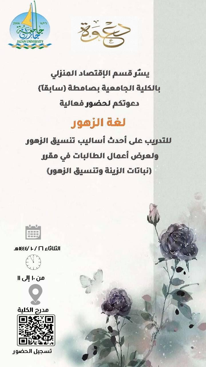 نظمت الكلية التطبيقية بصامطة ممثلة في قسم الاقتصاد المنزلي فعالية بعنوان " لغة الزهور ". نفذتها طالبات مقرر نباتات الزينة وتنسيق الزهور تحت إشراف د. سناء عناني، واستهدفت جميع منسوبات الكلية.