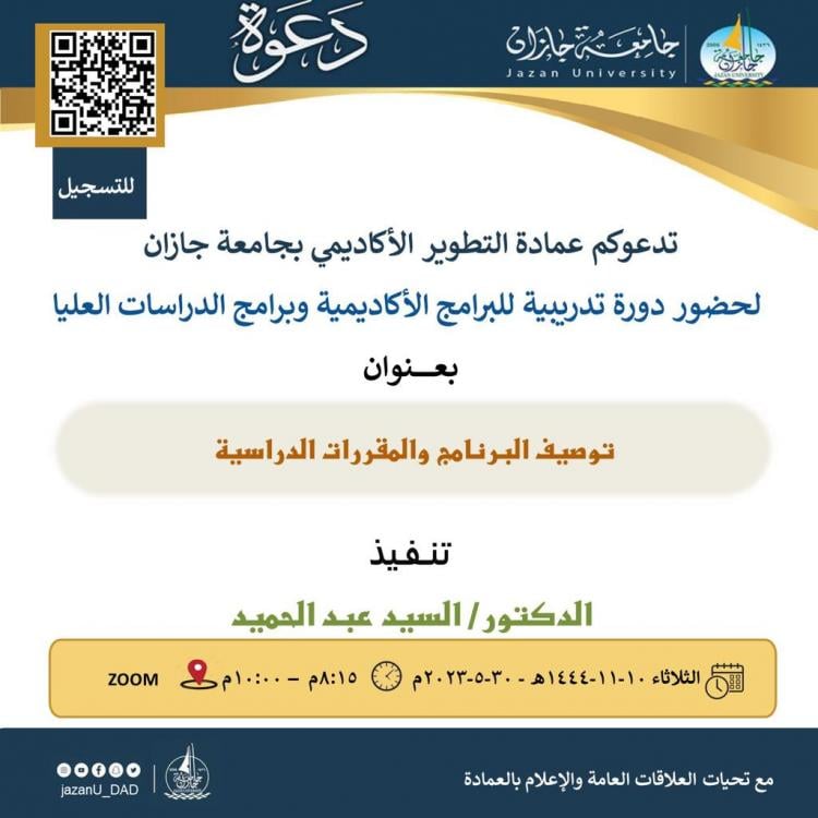 نظمت عمادة التطوير الأكاديمي برنامجاً تدريبيا بعنوان "توصيف البرنامج والمقررات الدراسية نفذه الدكتور السيد عبد الحميد، من خلال برنامج الزوم مستهدفا أعضاء هيئة التدريس، ويبين فيه كيفية بناء توصيف البرنامج وتوصيف المقررات على نماذج الهيئة الوطنية NCAAA2022.