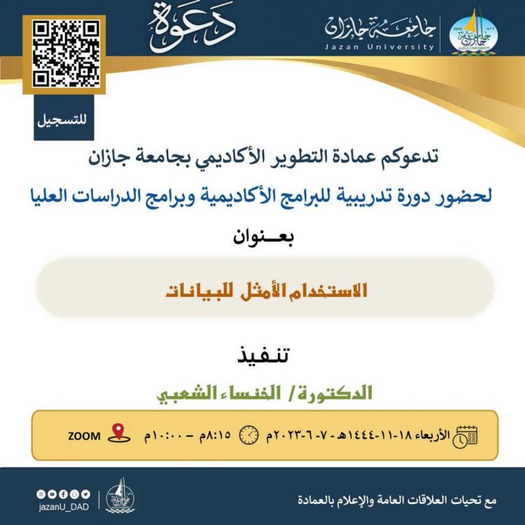 نفذت عمادة التطوير الأكاديمي برنامجاً تدريبياً بعنوان" الاستخدام الأمثل للبيانات" نفذته الدكتورة الخنساء الشعبي مستشارة العمادة، وذلك عبر برنامج زووم.