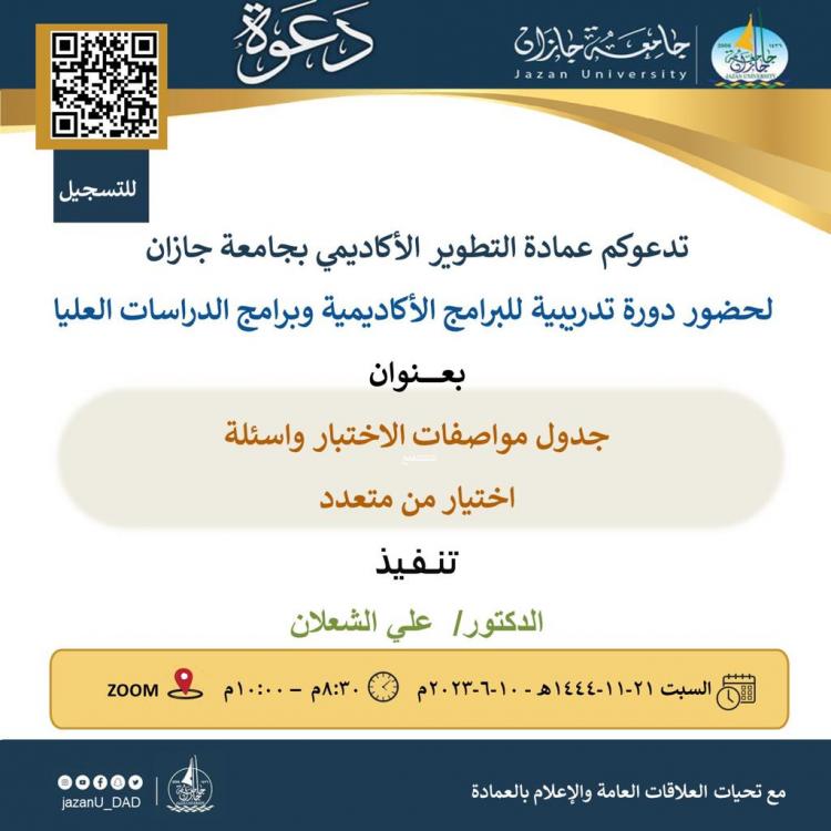 نظمت عمادة التطوير الأكاديمي برنامجًا تدريبيا بعنوان "جدول مواصفات الاختبار وأسئلة الاختيار من متعدد، نفذه الدكتور علي الشعلان عبر برنامج الزوم مستهدفا أعضاء هيئة التدريس.