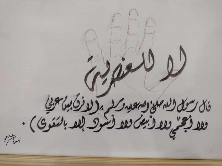 تحت شعار ( الإسلام ونبذ التطرف والعنصرية) أقامت كلية الآداب والعلوم الإنسانية (شطر الطالبات) معرضا للوحات فنية وابداعات للخط العربي تعبر عن الفكرة المطروحة ،وأقيم المعرض برعاية وكيلة الكلية د. غادة ذبالي تحت إشراف وحدة النشاط الطلابي.