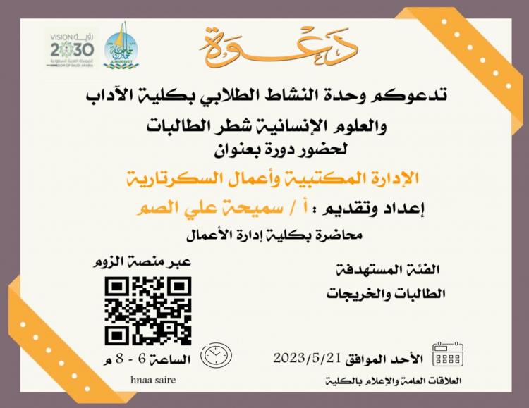 في إطار إعداد الطالبات الدخول سوق العمل، عقدت كلية الآداب والعلوم الإنسانية شطر الطالبات، بإشراف وحدة النشاط الطلابي، دورة بعنوان( الإدارة المكتبية وأعمال السكرتارية) أعدتها وقدمتها الأستاذة سميحة الصم المحاضر بكلية إدارة الأعمال حيث أوضحت للطالبات مهام الإدارة وأعمالها، وفن السكرتارية، استهدفت الدورة فئةالخريجات خاصة وحضرها كثير من الطالبات.
