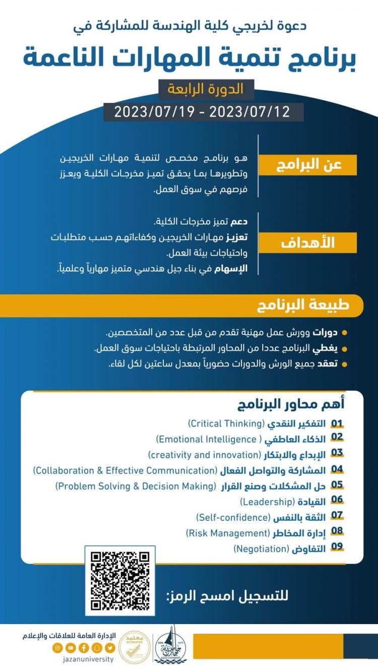 نفذت كلية الهندسة بجامعة جازان برنامج تنمية المهارات الناعمة في نسخته الرابعة والذي يهدف إلى تنمية مهارات الطلاب وتطويرها بما يحقق تميز مخرجات الكلية ويعزز فرصهم في سوق العمل.