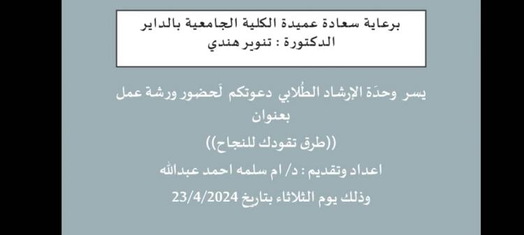 ضمن الخطة التنفيذية لعمادة شؤون الطلاب وتحت رعاية عميدة الكلية الجامعية بمحافظة الداير الدكتورة تنوير هندي قدمت وحدة الإرشاد الطلابي ورشة عمل بعنوان طرق تقودك لتحصيل دراسي فعال قدمتها الدكتورة أم سلمه أحمد.