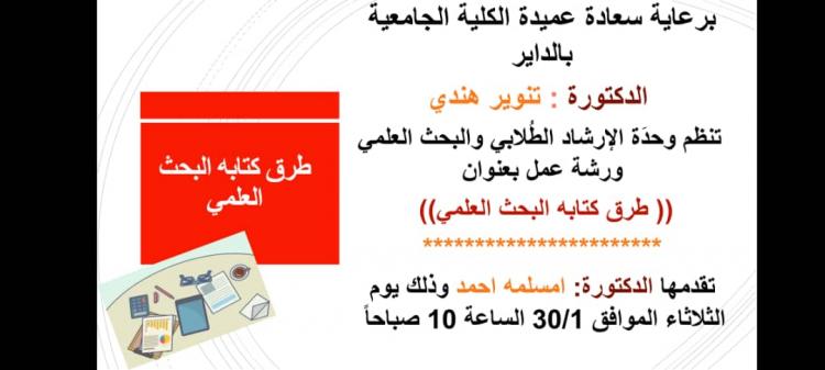 قدمت وحدة الإرشاد الطلابي في الكلية الجامعية بالداير ورشة عمل بعنوان طرق كتابة البحث العلمي قدمتها دكتورة أم سلمة أحمد تناولت أهمية البحث العلمي وأن البحوث العلمية تعتبر المرآة العاكسة لمستوى وطبيعة التطور الحاصل لأي دولة ومن السبل الكفيلة لضمان جودة منتجاتها وتعزيزها.