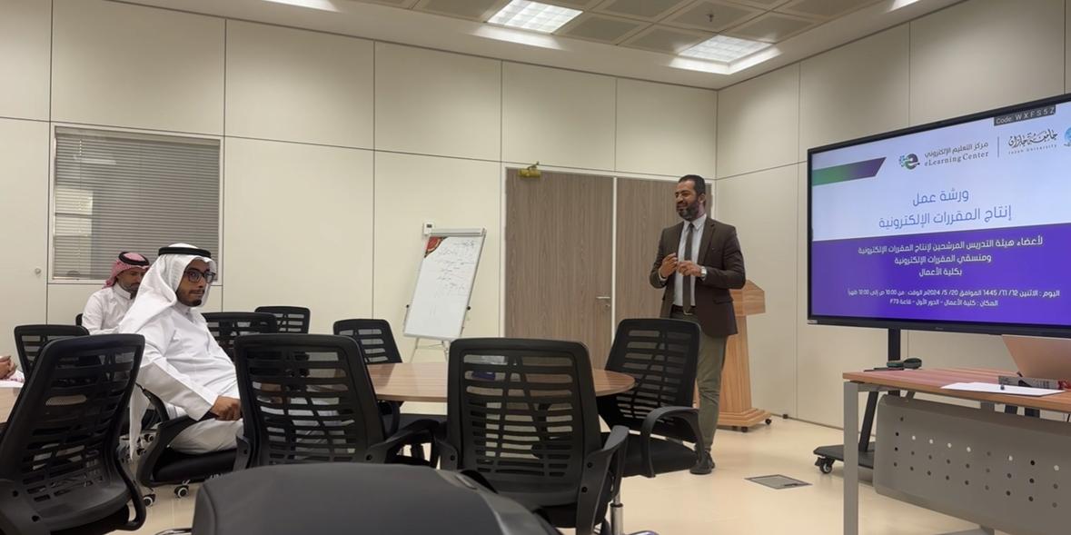 بالتعاون مع كلية الأعمال عقد مركز التعليم الإلكتروني ورشة عمل لمنسقي إنتاج المقررات الإلكترونية بكلية الأعمال حول خطوات إنتاج المقررات الإلكترونية بحضور وكيل الكلية للجودة والتطوير الدكتور ناصر خلوفي ومنسقي الأقسام من أعضاء هيئة التدريس بالكلية، واشتملت الورشة على مجموعة من المحاور المتعلقة بمراحل إنتاج المقرر الإلكتروني ومعايير التصميم وعرض نماذج من المقررات الإلكترونية المنتجة من قبل، وتخلل اللقاء مجموعة من المداخلات والاستفسارات من قبل منسقي المقررات الإلكترونية بالكلية، وعلى هامش تلك الورشة تشرف أعضاء فريق المركز بلقاء عميد كلية الأعمال حيث رحب بهم وأكد حرص الكلية على إنتاج جميع مقرراتها والعمل مع المركز في تحقيق ذلك.