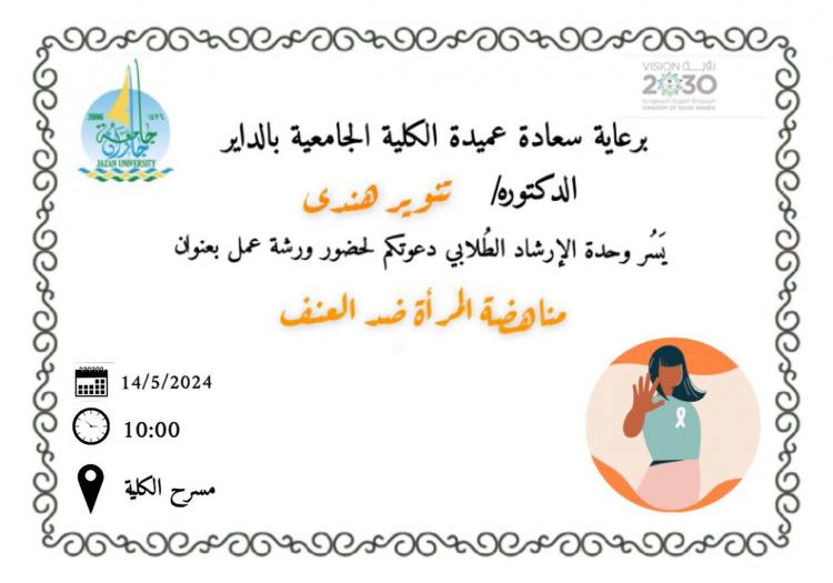 أقامت وحدة الإرشاد الطلابي في الكلية الجامعية بالداير ورشة عمل بعنوان مناهضة المرأة ضد العنف قدمتها د. أم سلمه أحمد تناولت مفهوم العنف وأسبابه وأنواعه الجسدي والنفسي واللفظي والاقتصادي والعنف الالكتروني كالاختراق والتحرش والتنمر والابتزاز.