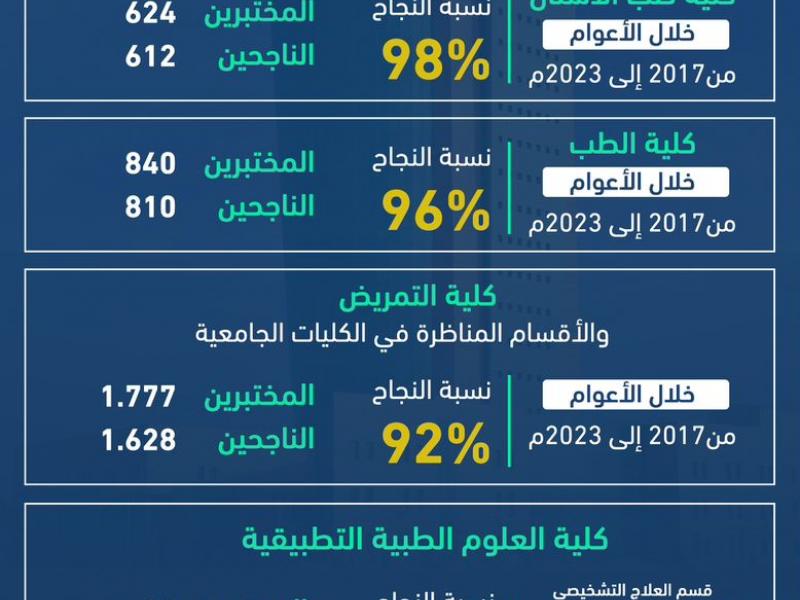 أما كلية الطب وخلال الفترة ما بين 2017 – 2023م فالمتقدمون للاختبار بلغ 840 متقدما اجتازه منهم 810 طالبا وطالبة بنسبة نجاح بلغت 96%.