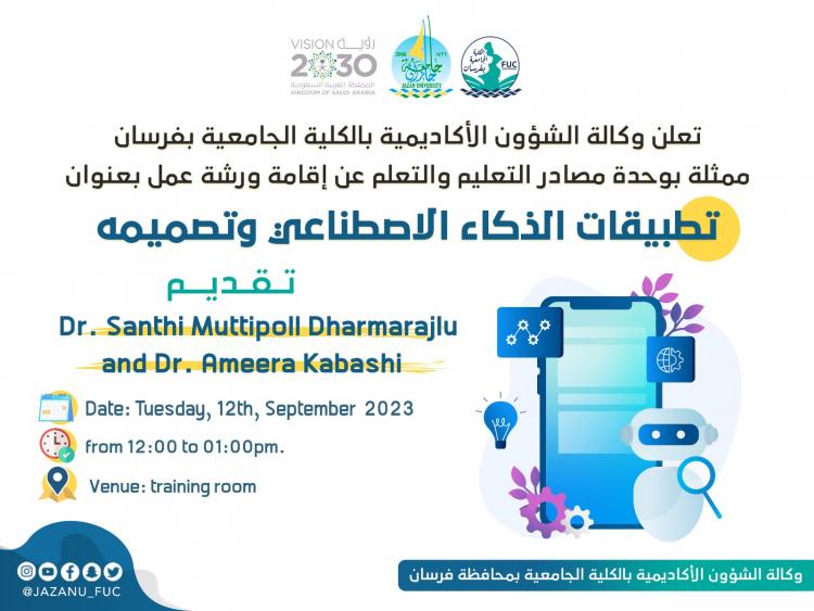 أقامت الكلية الجامعية بفرسان ممثلة في وحدة التعلم والتعليم الالكتروني برعاية عميدة الكلية الدكتورة عفاف محمد با بعير ورشة عمل بعنوان: تطبيقات الذكاء الاصطناعي في تصميم العروض التقديمية، نفذتها الدكتورة سانتي ميتبول والدكتورة أميرة كباشي وحضرها 19 عضو هيئة تدريس وعالجت عدة مواضيع منها: ( مقدمة للذكاء الاصطناعي، أهمية واستخدامات الذكاء الاصطناعي وتأثيره على العمل والمجتمع) .