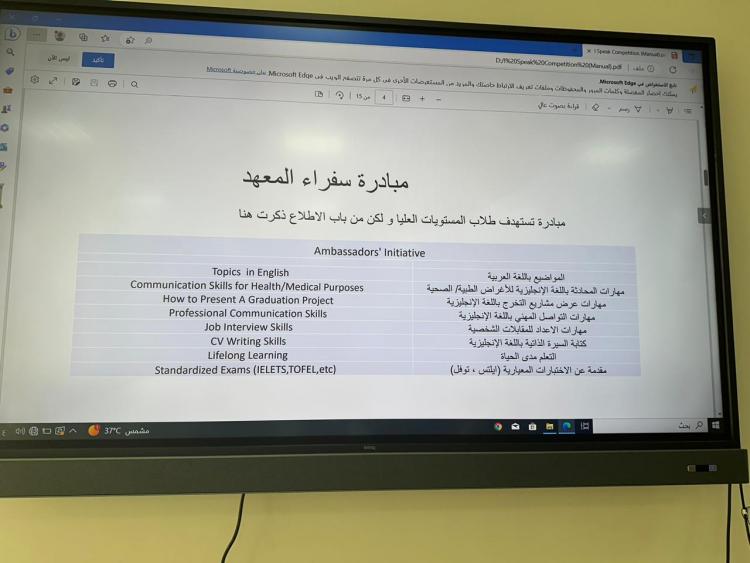 كما تم عمل مسابقة الخطابة العامة (أنا أتكلم) ومبادرة سفراء المعهد والتي تستهدف طلاب وطالبات المستويات العليا في الجامعة.