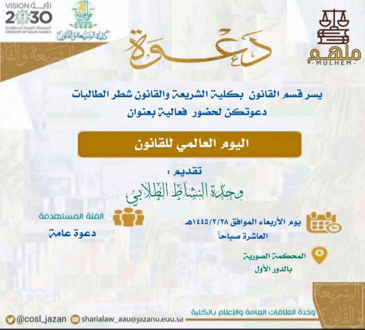 أقامت وحدة النشاط الطلابي بقسم القانون بكلية الشريعة والقانون شطر الطالبات فعالية اليوم العالمي للقانون بحضور طالبات القسم وأعضاء هيئة التدريس والإداريات.