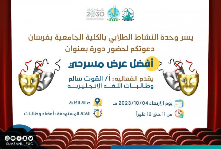 نفذت الكلية الجامعية بفرسان برعاية عميدة الكلية الدكتورة عفاف محمد با بعير وإشراف وكيلة الكلية للشؤون الأكاديمية الدكتورة عيش يحيى مدخلي ممثلة في وحدة النشاط الطلابي دورة عن أفضل عرض مسرحي من إعداد وتقديم الدكتورة ألقوت سالم وطالبات قسم اللغة الإنجليزية .