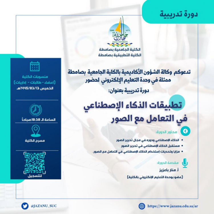 نفذت الكلية التطبيقية بصامطة ممثلة في وحدة التعليم الإلكتروني دورة تدريبية بعنوان استخدامات الذكاء الاصطناعي في تحرير الصور، نفذتها أ. منار باعزيز واستهدفت منسوبات وطالبات الكلية حيث تطرقت من خلالها إلى التعريف بالذكاء الاصطناعي وأهميته واستخداماته وتأثيره علي العمل والمجتمع.