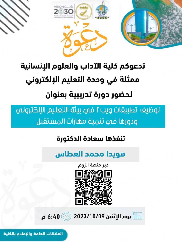 أقامت وحدة التعليم الإلكتروني بكلية الآداب والعلوم الإنسانية شطر الطالبات دورة بعنوان: توظيف تطبيقات ويب ٢ في بيئة التعليم الإلكتروني ودورها في تنمية مهارات المستقبل من إعداد وتقديم الدكتورة هويدا العطاس، المحاضرة بقسم العلوم الاجتماعية.