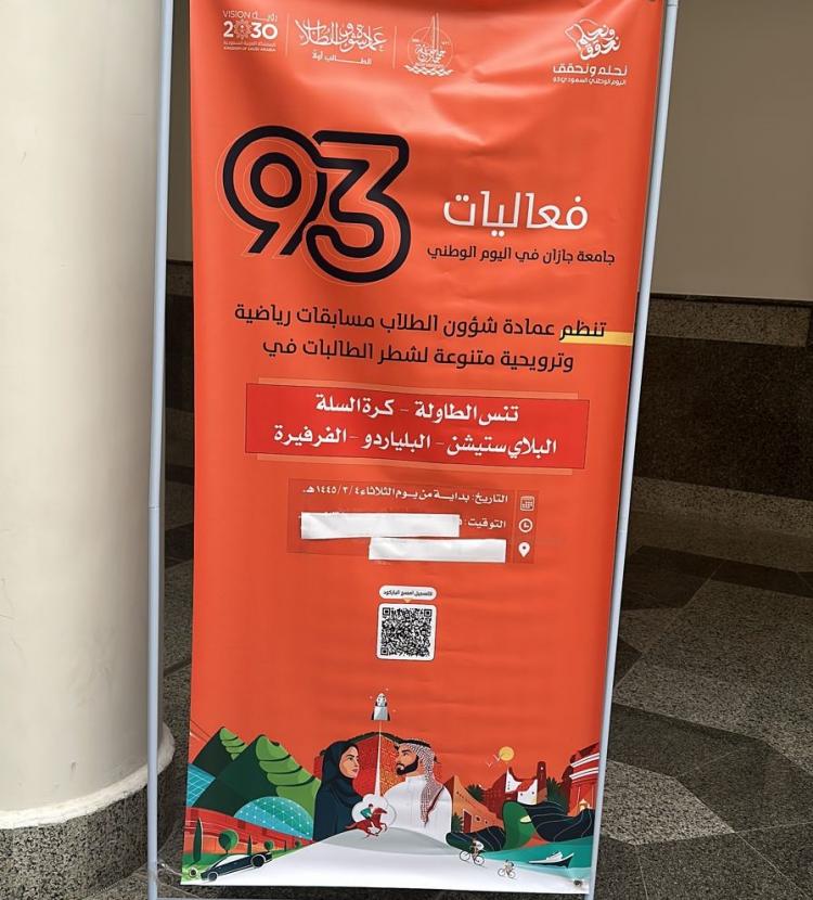 ضمن الفعاليات الاحتفالية باليوم الوطني السعودي الـ93 تحت شعار نحلم ونحقق نظمت جامعة جازان ممثلة في عمادة شؤون الطلاب شطر الطالبات مسابقات رياضية ترويحية متنوعة في ألعاب تنس الطاولة وكرة السلة والبلايستيشن والبلياردو وكرة الطاولة برعاية وكيلة الجامعة لشؤون الطالبات الدكتورة فاطمة بنت عبدالعزيز عقيلي وحضور وكيلة عمادة شؤون الطلاب لشطر الطالبات الدكتورة رشا مشهور والإداريات والطالبات وذلك في بهو المبنى الإداري بالمجمع الأكاديمي بمحلية.