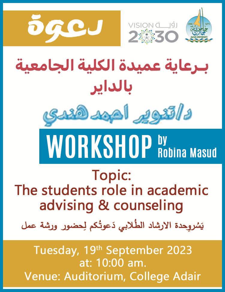 أقامت وحدة الإرشاد الطلابي في الكلية الجامعية بالداير ورشة عمل بعنوان دور الطالب في الإرشاد الطلابي برعاية عميدة الكلية الدكتورة تنوير أحمد هندي بمسرح الكلية قدمتها د. روبينا مسعود.