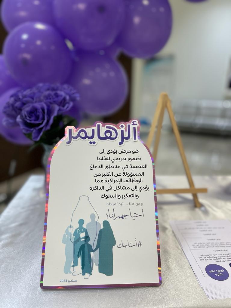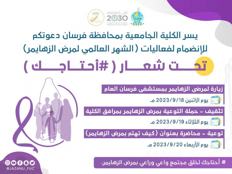 أقامت الكلية الجامعية بفرسان ممثلة في وحدة العلاقات العامة بمشاركة أقسام الكلية والطالبات برعاية كريمة من عميدة الكلية الدكتورة عفاف محمد با بعير وإشراف وكيلة الكلية للشؤون الأكاديمي الدكتورة عيش يحيى مدخلي ـ تضامنا مع فعاليات الشهر العالمي لمرضى الزهايمر ـ حملة لمرضى الزهايمر تحت شعار أحتاجك بواقع ثلاثة أيام بهدف خلق مجتمع واع وراع لمرضى الزهايمر.