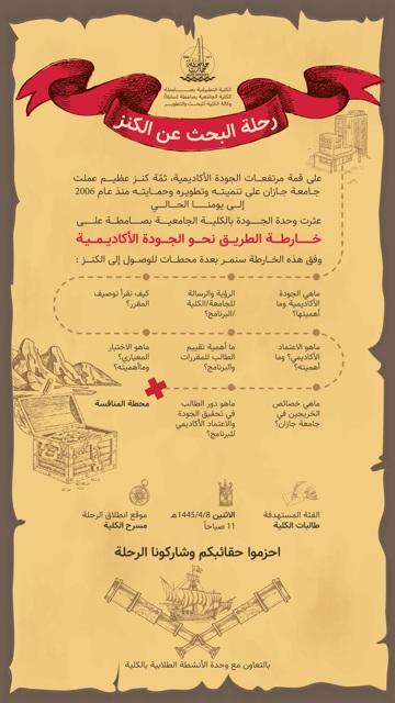 نفذت وكالة البحث والتطوير بالكلية الجامعية بصامطة (سابقاً) ممثلة في وحدة الجودة بالتعاون مع وحدة الأنشطة الطلابية فعالية بعنوان "رحلة البحث عن الكنز- وفق خارطة الجودة الأكاديمية".