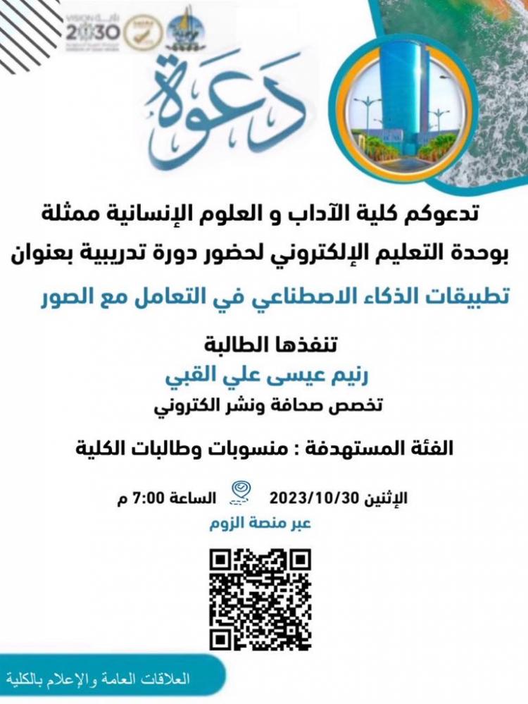 عقدت كلية الآداب و العلوم الإنسانية( شطر الطالبات) ممثلة في وحدة التعليم الإلكتروني، دورة بعنوان "تطبيقات الذكاء الاصطناعي في التعامل مع الصور " نفذتها الطالبة/ رنيم عيسى علي القبي بقسم الصحافة و الإعلام