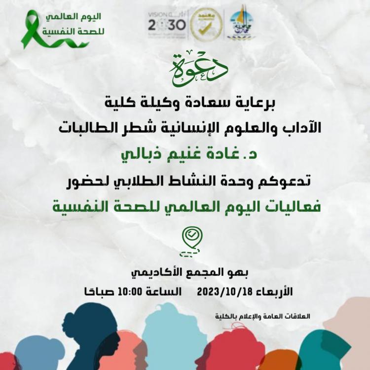 فعلت كلية الآداب والعلوم الإنسانية (شطر الطالبات) اليوم العالمي للصحة النفسية، على مدار ثلاثة أيام ،بإقامة فعالية ترفيهية للطالبات بالصالة الرياضية بالمجمع. ومحاضرة للدكتورة رجاء شوعي، تحت عنوان ،" قوة الثقة بالنفس" واستضافت وحدة النشاط الطلابي بالكلية كلية طب الصحة العامة التي أقامت معرضا توعويا للصحة العقلية والنفسية افتتحته وكيلة الكلية د/ غادة ذبالي ، وشهد المعرض حضورا كبيرا من الطالبات والمنسوبات ،اللاتي أشدن بكل ما قدم من إرشادات ومعلومات نفسية مهمة.