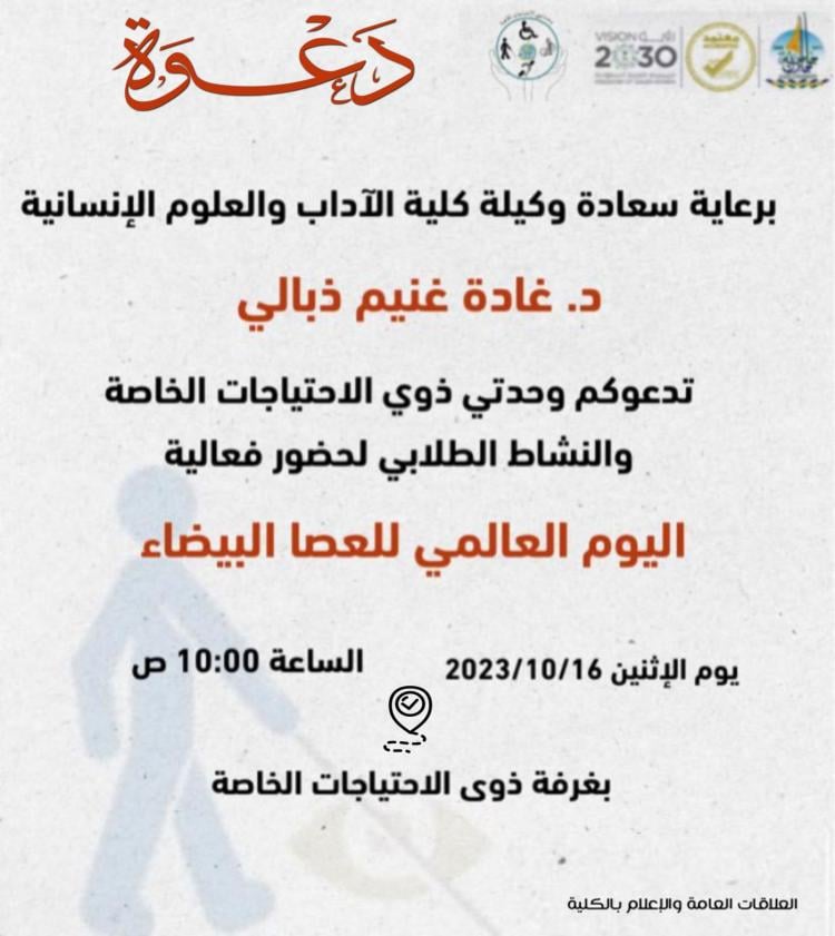 احتفت كلية الآداب والعلوم الإنسانية شطر الطالبات بطالباتها من ذوي الاحتياجات الخاصة وذلك في "اليوم العالمي للعصا البيضاء " برعاية وكيلة الكلية وبإشراف وحدتي ذوي الاحتياجات الخاصة، والنشاط الطلابي.