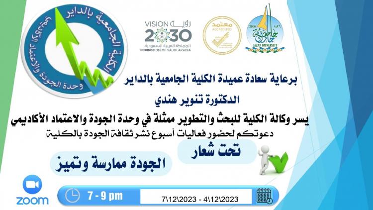 نظمت وكالة الكلية الجامعية بالداير للبحث والتطوير ممثلة في وحدة الجودة والاعتماد الأكاديمي فعاليات أسبوع نشر ثقافة الجودة بالكلية تحت شعار الجودة ممارسة وتميز عبر تطبيق الزووم برعاية عميدة الكلية الجامعية بالداير الدكتورة تنوير هندي.