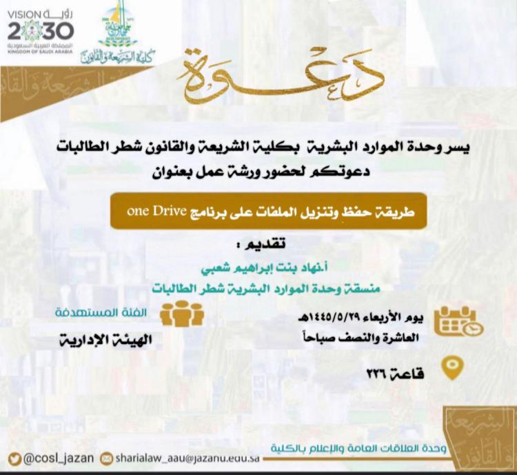 نفذت منسقة وحدة الموارد البشرية بكلية الشريعة والقانون شطر الطالبات الأستاذة نهاد بنت إبراهيم شعبي ورشة عمل بعنوان طريقة حفظ وتنزيل الملفات على برنامج ( one drive ) تناولت فيها التعريف بالخدمة من (Microsoft ) السحابية وتوضيح كيفية تنزيل جميع الملفات من ملفات العمل كالملف الإنجازي الإلكتروني.