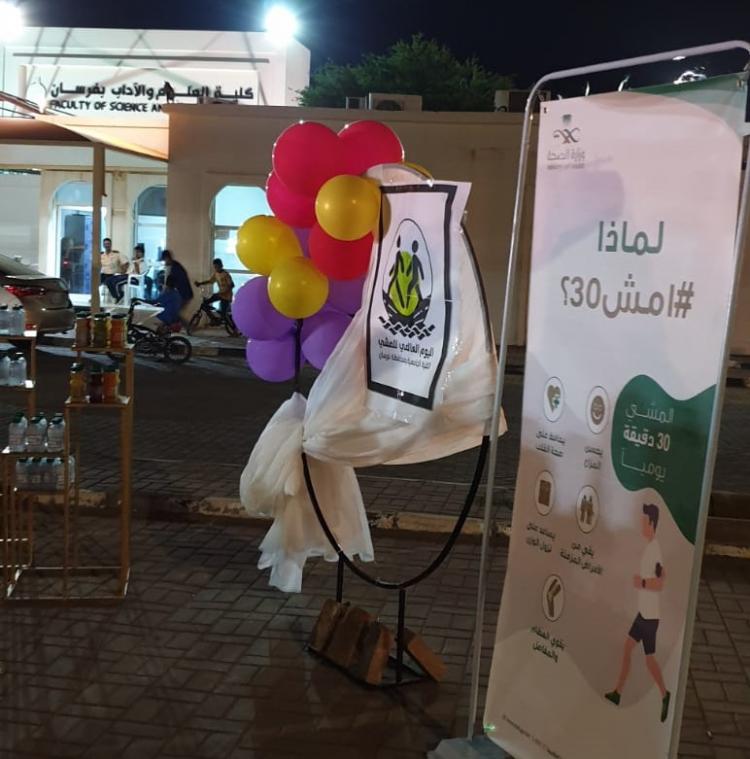 حيث فعلت رياضة المشي لمدة ساعة بواقع يومين في اليوم الأول تم التفعيل داخل الكلية، وفي اليوم جرى التنفيذ خارج الكلية بالتعاون مع الفريق التطوعي بمستشفى فرسان العام، وهدفت الفعالية إلى تعزيز ثقافة الصحة العامة ورياضة المشي، ومساعدة أفراد المجتمع في تقليل الإصابة بالأمراض المزمنة مثل السكري والقلب وارتفاع ضغط الدم، وكذلك المساهمة في مكافحة السمنة والمحافظة على وزن صحي.