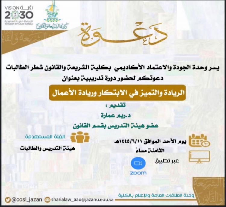 نفذت وحدة الجودة والاعتماد الأكاديمي بكلية الشريعة والقانون دورة بعنوان الريادة والتميز في الابتكار وريادة الأعمال قدمتها الدكتورة ريم عمارة عضو هيئة التدريس بقسم القانون