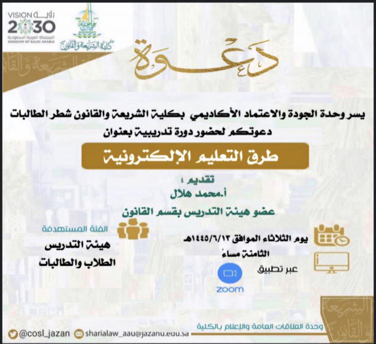 نفذت وحدة الجودة والاعتماد الأكاديمي بكلية الشريعة والقانون دورة تدريبية بعنوان طرق التعليم الإلكتروني قدمها الأستاذ محمد هلال عضو هيئة التدريس بقسم القانون تناول فيها الحديث عن ماهية التعليم الإلكتروني وأهميته وشرح صفات المعلم والمتعلم الإلكتروني والمهارات الشخصية والتقنية والتربوية ومهارات المعلم الإلكتروني ومسؤولياته وكيفية إنجاح عملية توصيل المعلومات عبر استخدام وسائل التكنولوجيا الحديثة، ودور البرامج الإلكترونية في خدمة المعرفة للطلاب وحث الطلاب والطالبات على استخدام تلك البرامج في التحصيل العلمي.