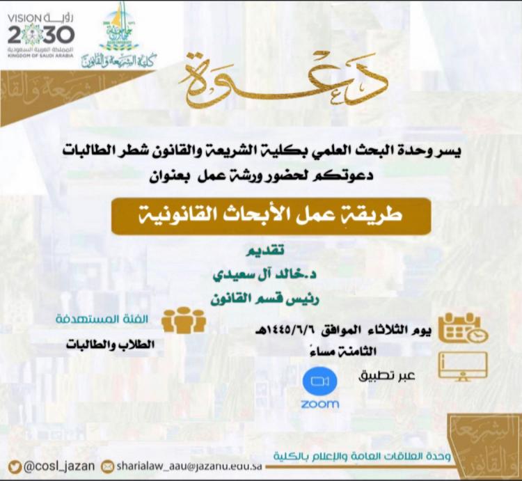 نفذت وحدة البحث العلمي بكلية الشريعة والقانون شطر الطالبات دورة تدريبية بعنوان طريقة عمل الأبحاث القانونية قدمها رئيس قسم القانون الدكتور خالد آل سعيدي تناول فيها التعريف بالأبحاث القانونية وكيفية إطلاع الطلاب بأهم مصادر الأبحاث القانونية، وطريقة كتابة الأبحاث القانونية.