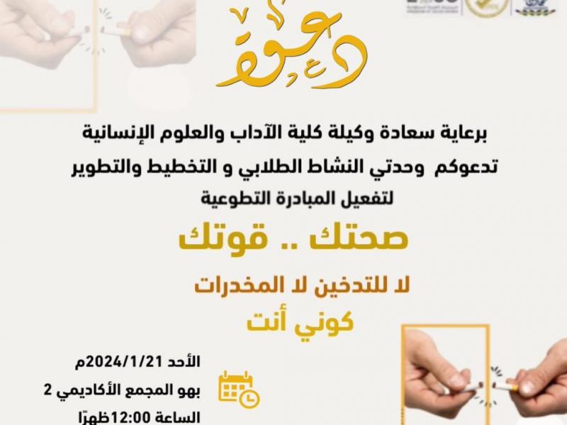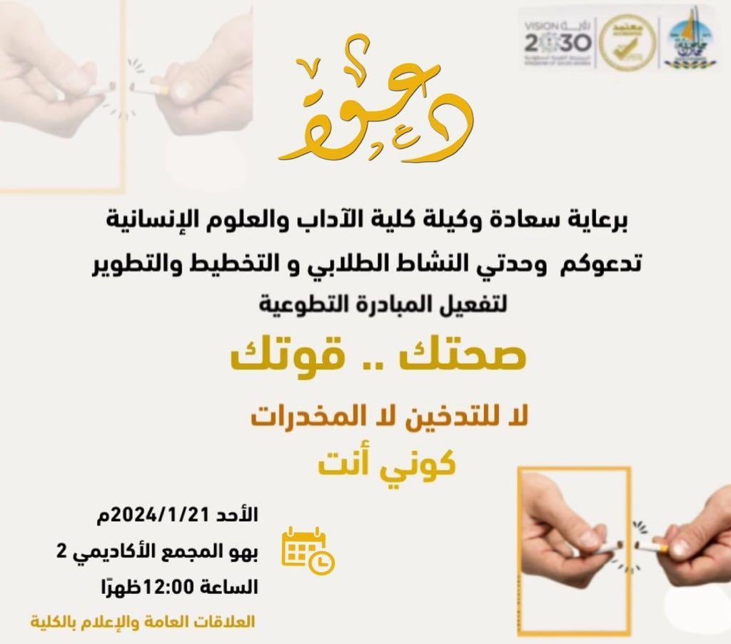 تحت شعار "صحتك قوتك " فعلت كلية الآداب والعلوم الإنسانية ممثلة في (الفريق التطوعي ووحدة التخطيط والتطوير) إحدى فعاليات مبادرة " كوني أنت " التي تهدف لتعريف الطالبات والمنسوبات بأضرار الإدمان والتدخين ومخاطرها خاصة علي صحة المرأة، برعاية وكيلة كلية الآداب ببهو المجمع؛ وذلك لحرص الكلية على التثقيف والإرشاد النفسي والصحي لأكبر عدد من الطالبات والمنسوبات.