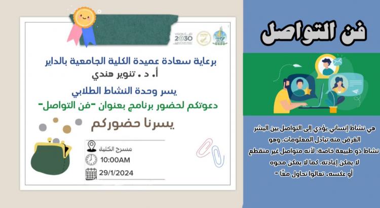 نظمت وحدة النشاط الطلابي في الكلية الجامعية بالداير بالتعاون مع قسم الرياضيات برنامجا بعنوان "فن التواصل " برعاية عميدة الكلية أ.د. تنوير أحمد هندي وقدمتها رئيسة وحدة النشاط الطلابي أ/ رشا أحمد.
