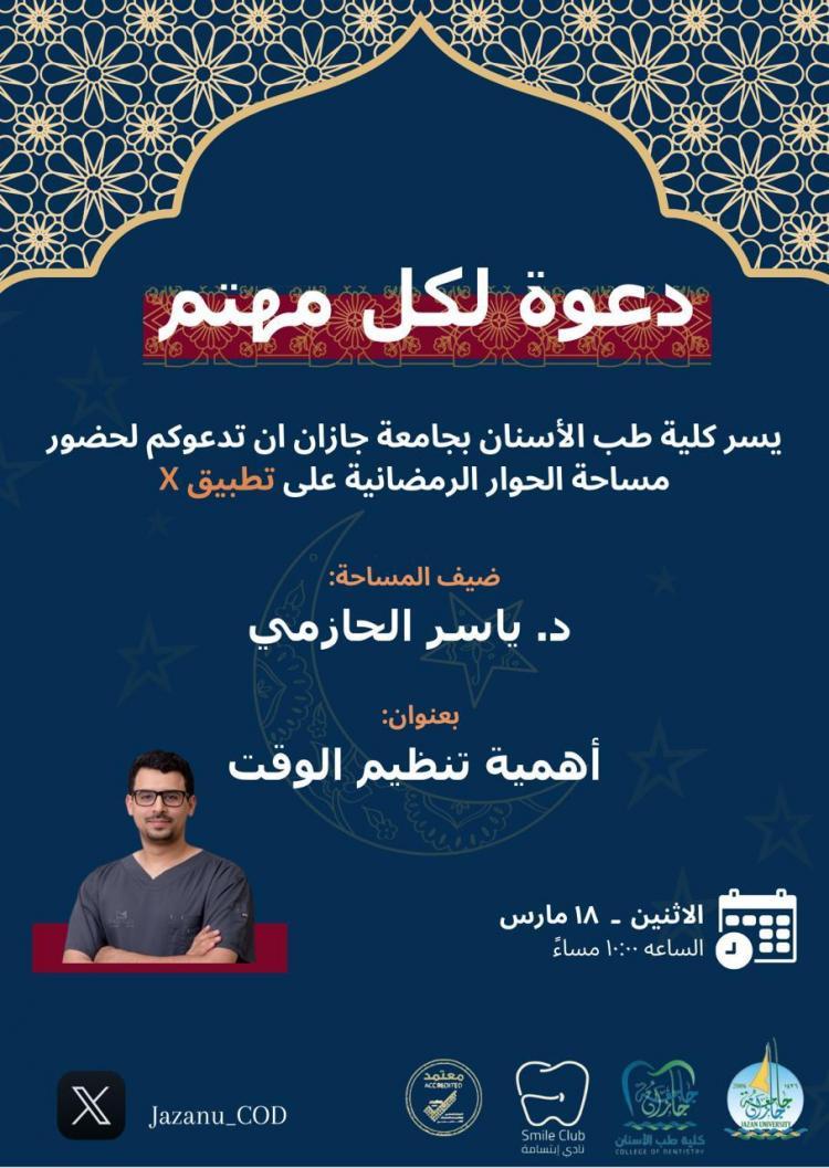 أطلقت كلية طب الأسنان بجامعة جازان يوم الأثنين المنصرم برنامجها (المساحة الرمضانية) عبر تطبيق X ، وكان عنوان المساحة الأولى (أهمية تنظيم الوقت) وضيف اللقاء وكيل الكلية للشؤون الأكاديمية الدكتور ياسر بن علي الحازمي، الذي استهل حديثه عن العادات الصحية المهمة في رمضان وأهمية استخدام السواك والفرشاة والمعجون للمحافظة على نظافة الفم.