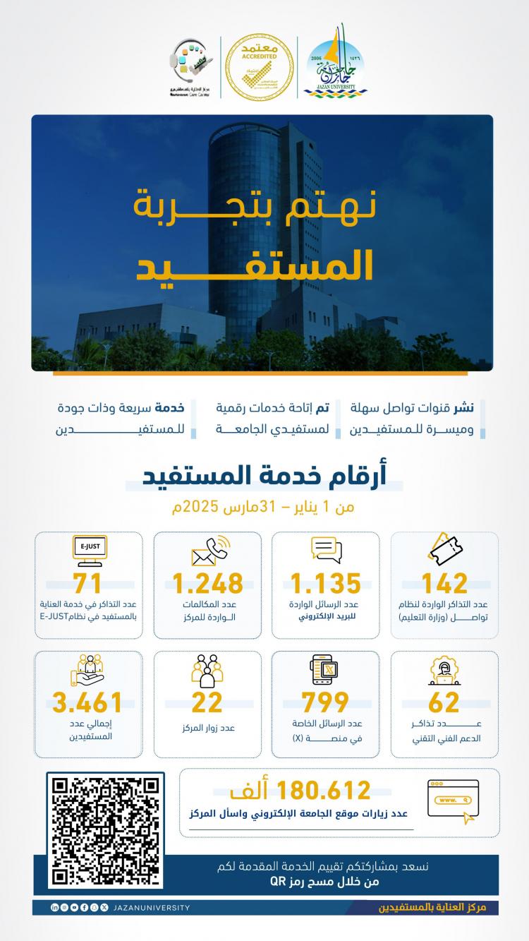 جامعة جازان تستعرض جهود مركز العناية بالمستفيدين خلال الربع الأول من عام 2025م: أكثر من 3400 مستفيد و180 ألف زيارة رقمية