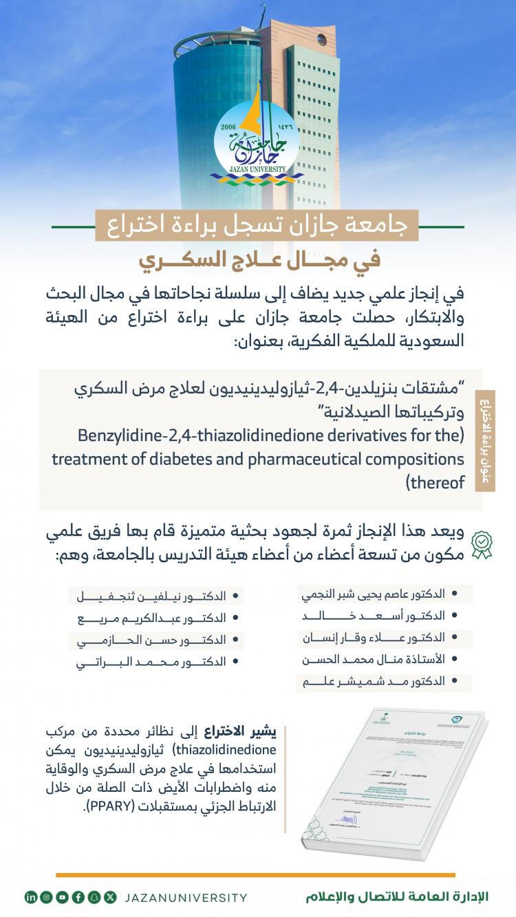 جامعة جازان تسجل براءة اختراع في مجال علاج السكري وتؤكد التزامها بدعم البحث العلمي والابتكار