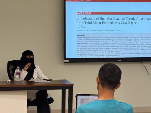 نظمت كلية طب الأسنان بجامعة جازان اللقاء الحادي عشر من سلسلة Journal Club وتم خلال اللقاء المقدم من قبل الدكتورة أسماء حزام حول موضوع حالة "تخثير الدم بالشريان السباتي قبل قلع ضرس العقل".