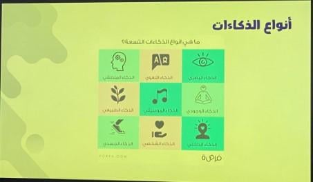 كما تم استعراض لأبرز أنواع الذكاء، مثل: الذكاء اللغوي، المنطقي-الرياضي، البصري-المكاني، الجسدي-الحركي، الموسيقي، الاجتماعي، الذاتي، والطبيعي، مع أمثلة تطبيقية على كل نوع.