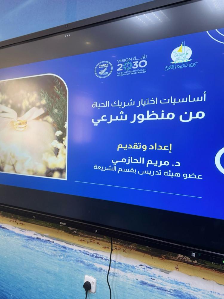 رعت وكيلة كلية الشريعة والقانون د. زمزم محمد هباب علي الدورة التدريبية التي أقامتها وحدة الأنشطة الطلابية بعنوان (أساسيات اختيار شريك الحياة من منظور شرعي) من إعداد وتقديم د. مريم الحازمي عضو هيئة تدريس بقسم الشريعة لتحسين جودة الحياة واستمرار الحياة الزوجية وحسن اختيار الشريك اختياراً واعياً من خلال خطوات يتخذها كل الطرفين وذلك في المحكمة الصورية بالمجمع الأكاديمي ١ .