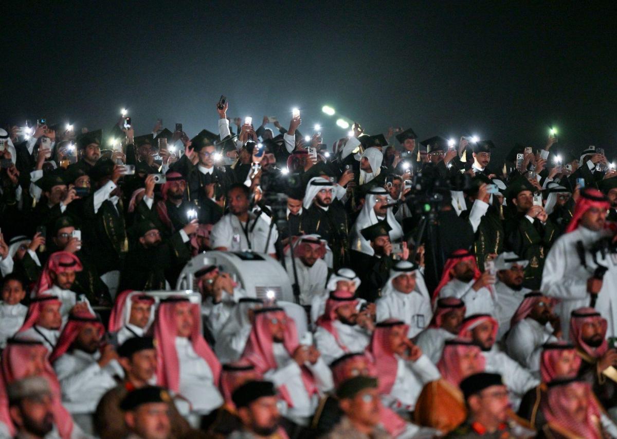 وفور وصول سموِّه مقر الحفل، بدأت مسيرة الخريجين الذين يمثلون مختلف كليات الجامعة العلمية والأدبية وأقسامها التخصصية النوعية، ثم بُدئ الحفل الخطابي بتلاوة آيات من القرآن الكريم.
