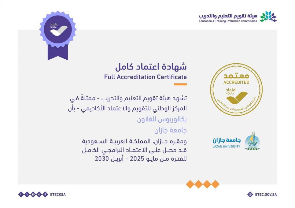 منحت هيئة تقويم التعليم والتدريب، ممثلة بالمركز الوطني للتقويم والاعتماد الأكاديمي، شهادات "اعتماد كامل" لعدد من برامج جامعة جازان المتميزة، وقد شملت هذه الاعتمادات ثلاثة برامج نوعية هي: بكالوريوس القانون، وبكالوريوس اللغة العربية، وبكالوريوس تقنية الأشعة التشخيصية.