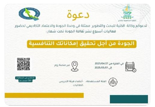 نظمت وكالة الكلية للبحث والتطوير بالكلية الجامعية بالداير ممثلة في وحدة الجودة والاعتماد الأكاديمي فعاليات أسبوع نشر ثقافة الجودة بالكلية تحت شعار "الجودة ممارسة وتميز من أجل تحقيق إمكاناتك المستقبلية".