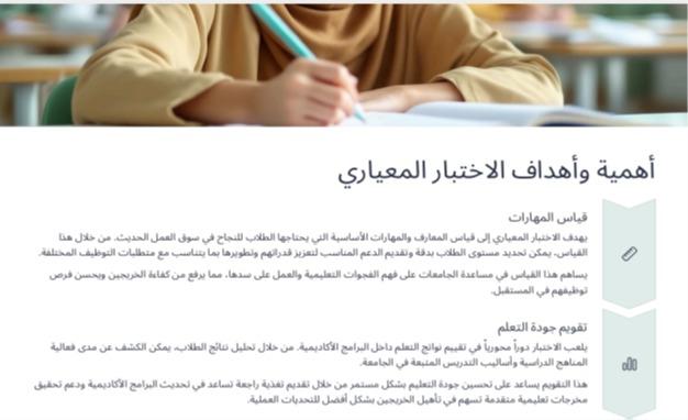 نفذ قسم اللغة الإنجليزية بالكلية الجامعية بالدايرممثلا بلجنة الاختبار المعياري ورشة تعريفية للطالبات المتوقع تخرجهن العام الحالي 2025 عن الاختبارات المعيارية تعريفها والهدف من إجرائها، قدمت الورشة الأستاذة عزيزة الفيفي حيث أوضحت أن هذه الورشة تهدف إلي التعريف بالاختبار المعياري وتبيان الأ÷داف من وضعه في قياس مهارات الطلبة الجامعيين وأهمية هذا الاختبار للطالبة والطالبة في مسيرتهم الأكاديمية والمهنية كما قامت بشرح وإيضاح عام للرؤية المستقبلية للجامعة من خلال تنفيذ مثل هذه الاختبارات.