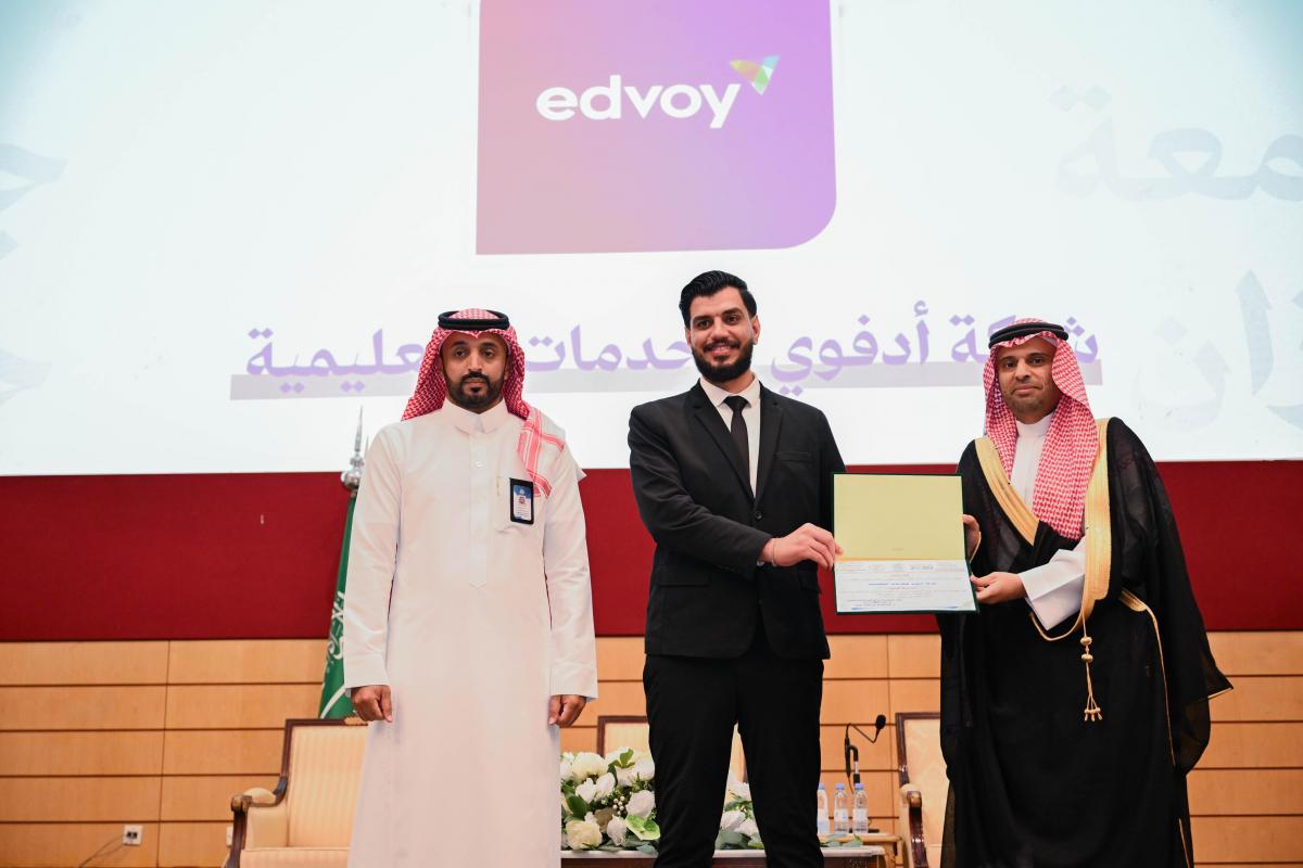 وشاهد الحضور فيديو تعريفيا عن (شركة إدفوي) التي تقدم العديد من الخدمات للمعيدين والمحاضرين والمبتعثين، وفي نهاية الحفل كرم وكيل الجامعة للدراسات العليا والبحث العلمي خريجي وخريجات الابتعاث وعددا من الجهات المتعاونة في تنظيم الملتقى.