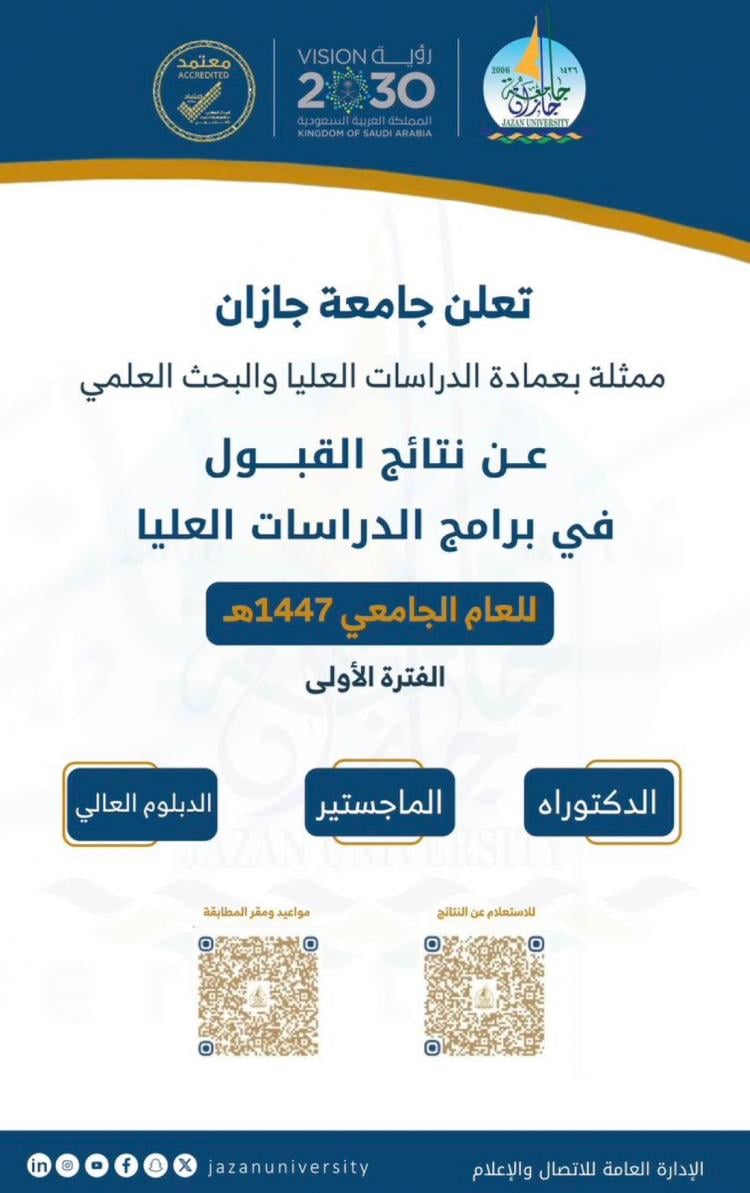 جامعة جازان تعلن نتائج القبول في برامج الدراسات العليا للعام الجامعي 1447