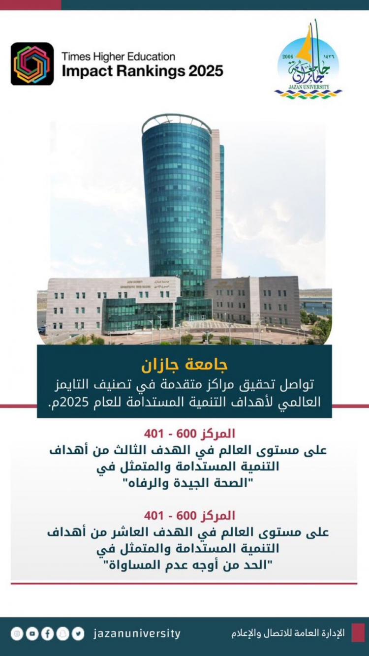 تواصل جامعة جازان إنجازاتها الأكاديمية والبحثية المرموقة، حيث حققت مراكز متقدمة في تصنيف التايمز العالمي لأهداف التنمية المستدامة لعام 2025.