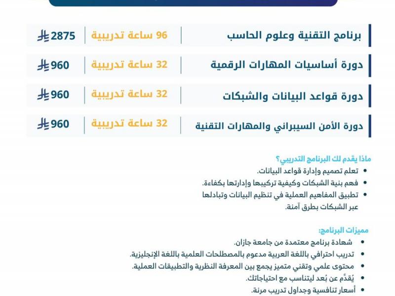 وتتميز جميع البرامج بالآتي: شهادة برنامج معتمدة من جامعة جازان، تدريب احترافي باللغة العربية مدعوم بالمصطلحات العلمية باللغة الإنجليزية، محتوى علمي وتقني مميز يجمع بين المعرفة النظرية والتطبيقات العملية، مرونة في الجداول لتناسب احتياجات المتدربين، مع خيارات للدراسة عن بُعد (أونلاين) أو في الفترة المسائية.