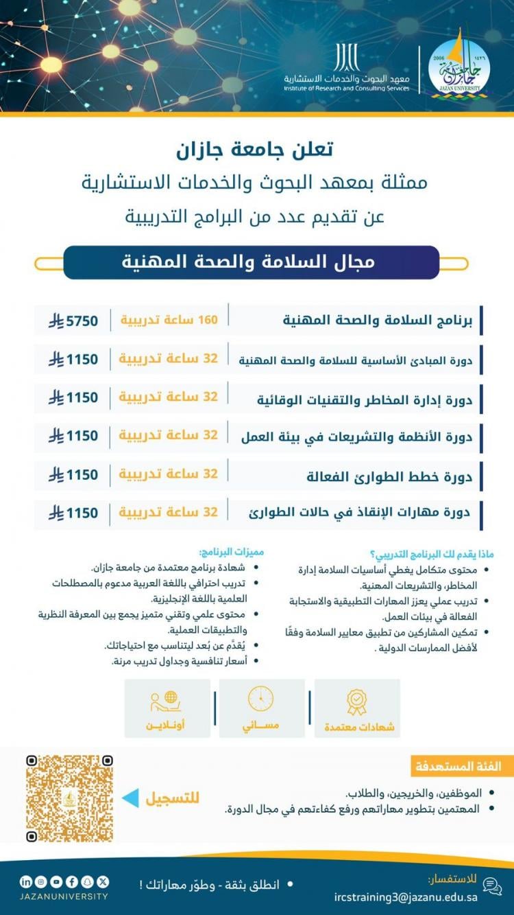 أعلنت جامعة جازان، ممثلة بمعهد البحوث والخدمات الاستشارية، عن إطلاق مجموعة من البرامج التدريبية المتخصصة في مجالَي السلامة والصحة المهنية، والتقنية وعلوم الحاسب. وتستهدف هذه البرامج الموظفين والخريجين والطلاب، بالإضافة إلى المهتمين بتطوير معارفهم ورفع كفاءاتهم. ودعت الجامعة الراغبين في الالتحاق بهذه الدورات التواصل عبر البريد الإلكتروني: [email protected].