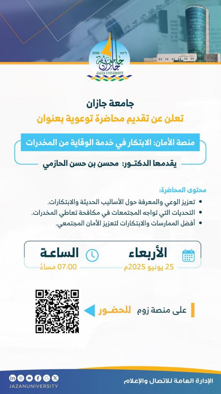 تقيم جامعة جازان محاضرة توعوية بعنوان "منصة الأمان – الابتكار في خدمة الوقاية من المخدرات"، مساء اليوم الأربعاء عبر الاتصال المرئي "زوم"، تهدف إلى تسليط الضوء على الدور المحوري للتقنيات الحديثة في التصدي لآفة المخدرات وتعزيز الوعي المجتمعي.