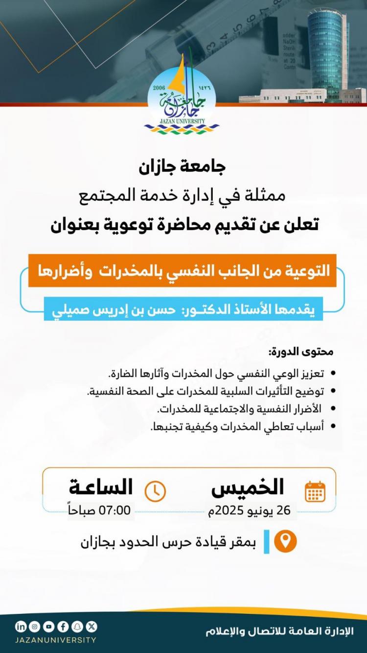 تقيم جامعة جازان، ممثلة في إدارة خدمة المجتمع بالتعاون مع كلية الفنون والعلوم الإنسانية، محاضرة توعوية بعنوان "التوعية من الجانب النفسي بالمخدرات وأضرارها". وذلك يوم الخميس الموافق 26 يونيو 2025، في تمام الساعة العاشرة صباحاً بمقر قيادة حرس الحدود بمنطقة جازان.